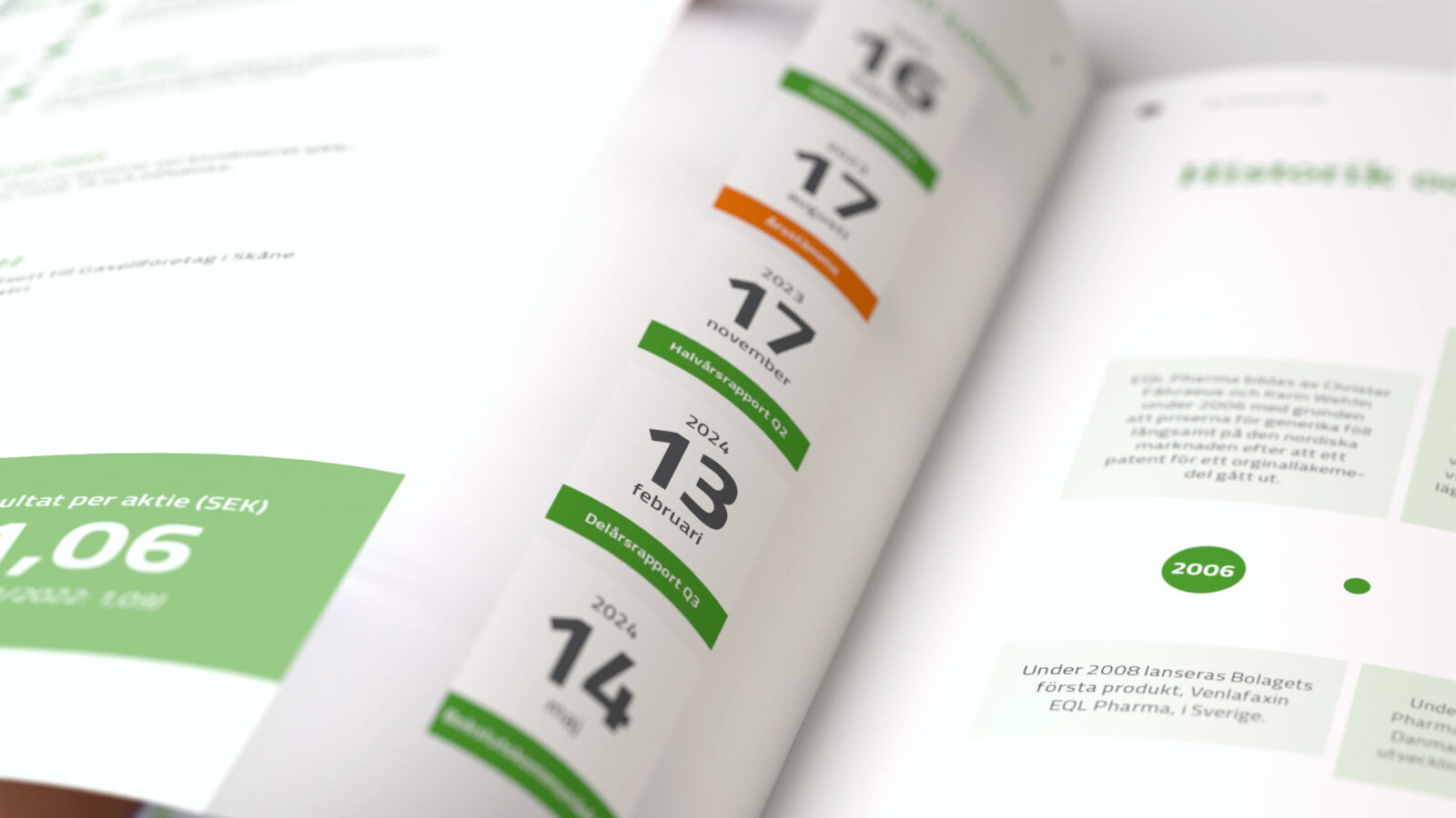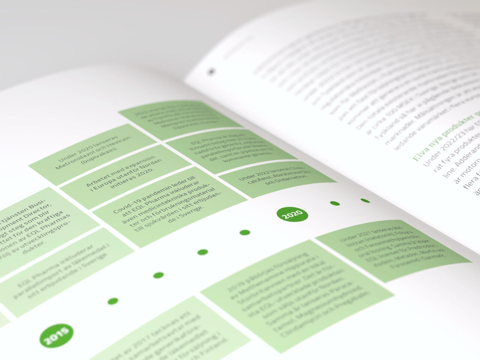 Clavis har producerat EQL Pharmas årsredovisning för 2022 och 2023. Produktionen har inneburit ett helhetsgrepp med utvecklad form och layout, utökade avsnitt, illustrationer och infografik.